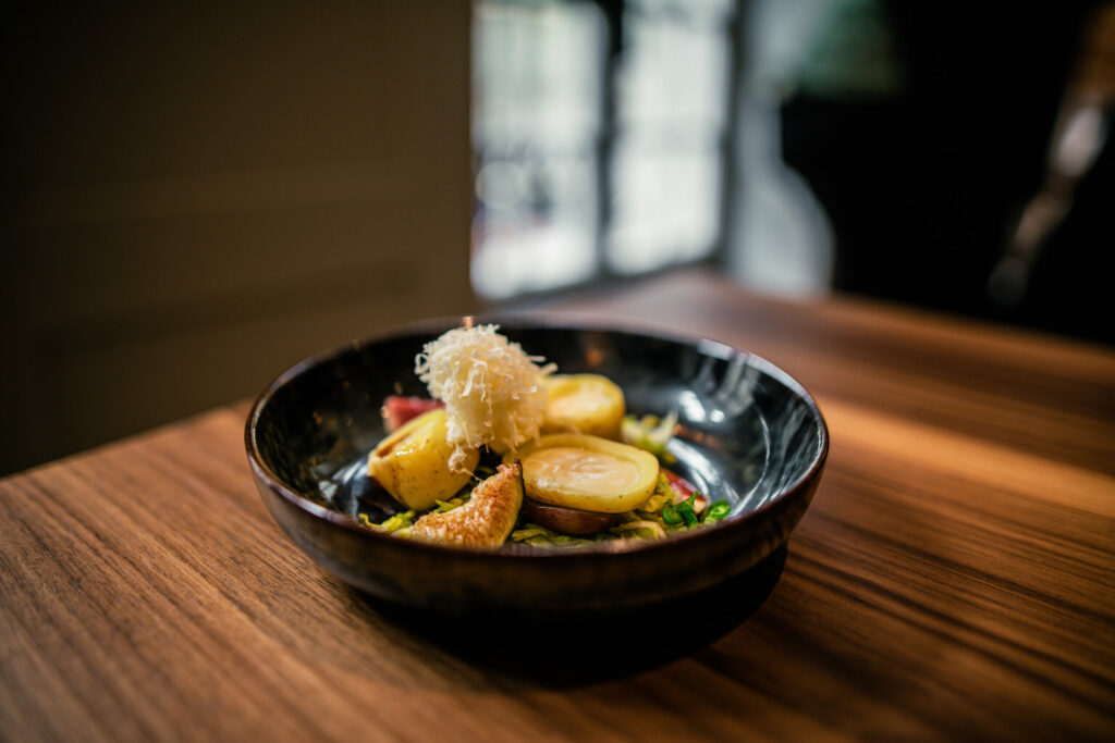 - Vorspeise: Bergkartoffeln mit Emmentaler-Crème, schwarzen Nüssen und Lattichsalat