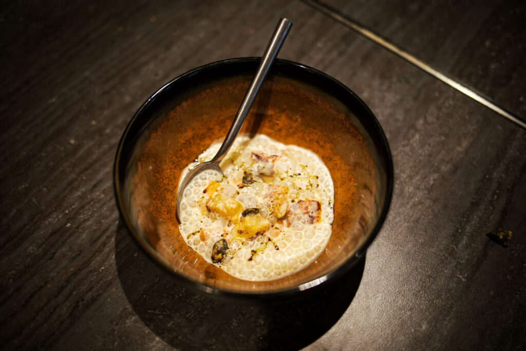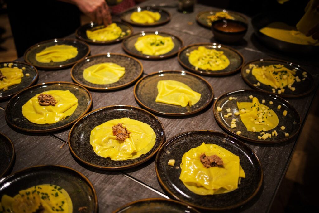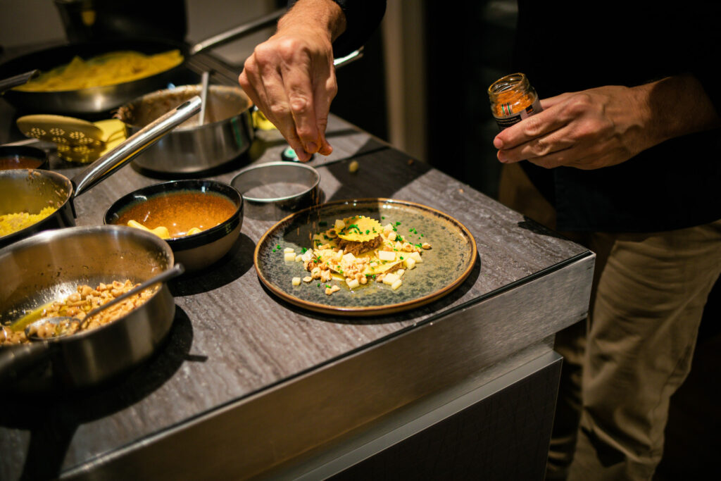 - Hauptspeise: Coq-au-vin-Raviolo mit Emmentaler-Haselnuss-Ragout