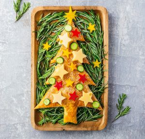 Ein Fest für die Sinne zum Fest der Liebe: Ein knuspriger Tannenbaum aus Blätterteig auf einem duftenden Rosmarinbett, geschmückt mit Sternen aus farbigen Peperoni und