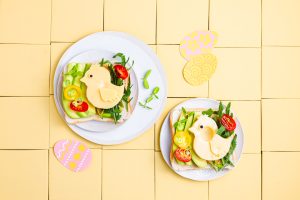 Frisch geschlüpft aus bunten Ostereiern machen es sich diese lustigen Käse-Küken in einem Nest aus Avocado und Rucola gemütlich. Die knusprigen Toasts sind ein Hingucker