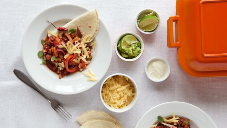 Chili anrichten, mit Koriander, Joghurt, Limettenschnitzen, Maistortillas, Guacamole und grob geriebenem Emmentaler AOP servieren.