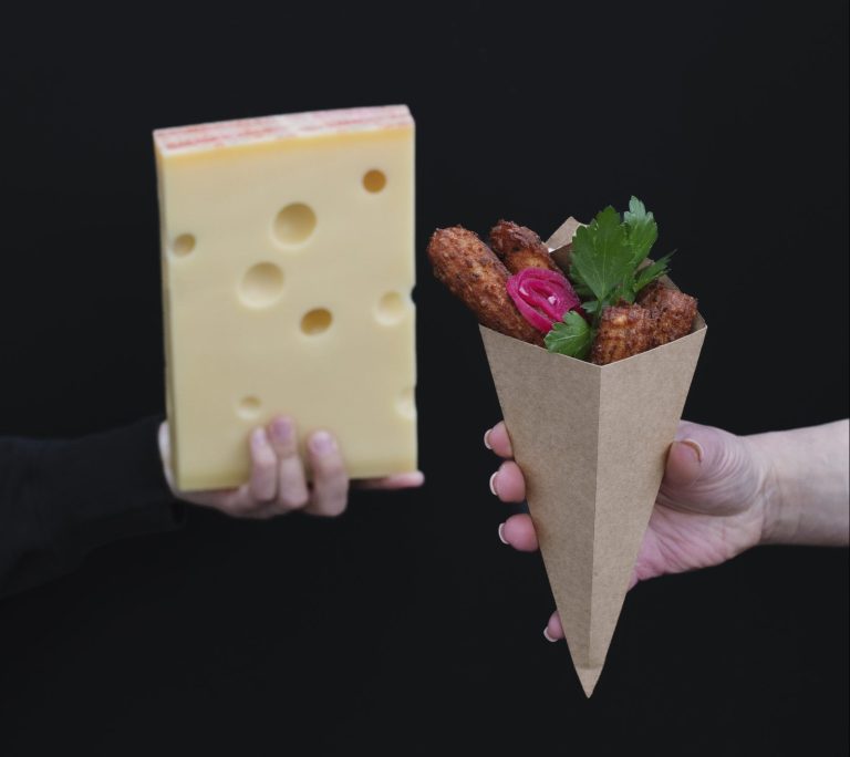 «Fein gehobelter Emmentaler AOP Höhlengereift macht sich bestens in einem "höhlisch-guten" Cheeseburger: im luftigen Urdinkelbrötli mit einer Tomatenscheibe, ein paar Röstzwiebeln und einem Löffel Crème fraîche.»