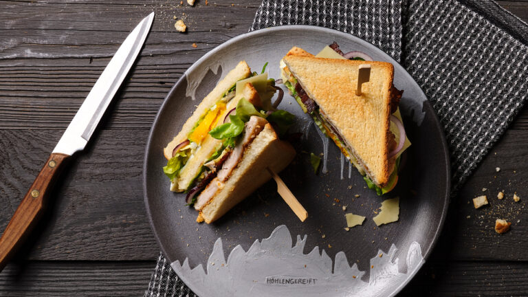 Das erste Toastbrot mit Sauce bestreichen, Salat, Avocado, Zwiebeln, Spiegelei und Emmentaler AOP darauflegen. Das mittlere Toastbrot beidseitig mit Sauce bestreichen und auf das Sandwich legen. Nun den vorherigen Ablauf mit den gleichen Zutaten wiederholen und mit dem letzten bestrichenen Toastbrot belegen.