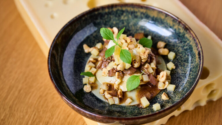 Anrichten: Das gepullte Fleisch mit Gemüse und etwas Saft erhitzen und zwischen den gekochten und erwärmten Teigblätter anrichten. Das Emmentaler-AOP-Haselnuss-Ragout darüber geben, mit Sauerrahm und Basilikumblätter garnieren, abschmecken.