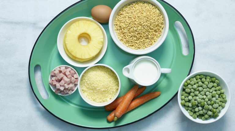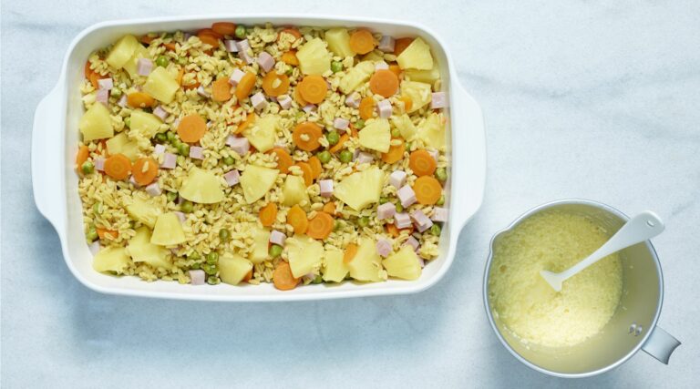 Ananas in Stücke schneiden, mit den Schinkenwürfeli zum Ebly geben. Eier, Milch und Emmentaler AOP zusammen verrühren. Mit Salz und Pfeffer würzen.