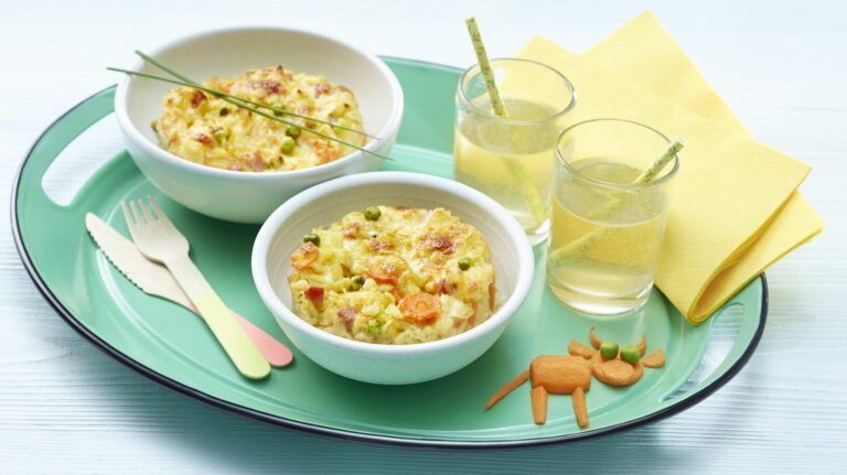 Guss mit dem Ebly mischen. In eine eingefettete Gratinform füllen. In der Mitte des 200 Grad heissen Ofen 20-25 Minuten backen.