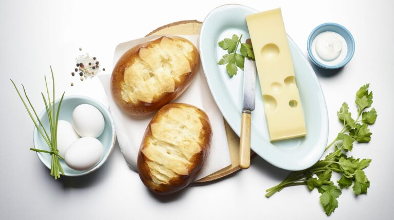 Brötchendeckel wegschneiden. Das Innere der Brötchen auslösen (kann als Paniermehl weiterverwendet werden). Schnittlauch in Röllchen schneiden, ein wenig davon für die Garnitur reservieren. Petersilie hacken. Emmentaler AOP fein reiben. Kräuter mit 75 g Emmentaler AOP und saurem Halbrahm verrühren, würzen.