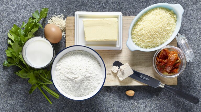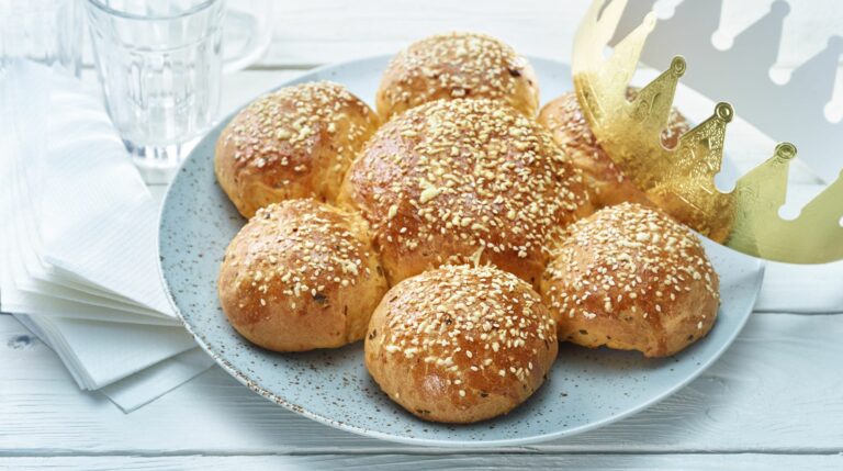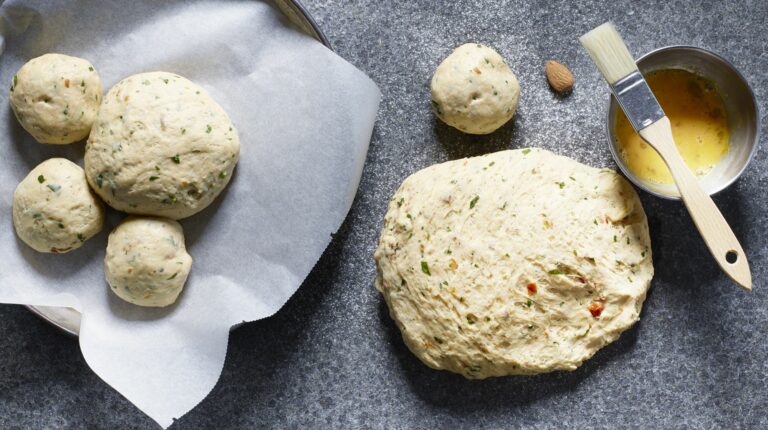 Aus einem Viertel des Teiges eine Kugel formen. Auf ein mit Backpapier belegtes Blech legen. Aus dem restlichen Teig kleinere Kugeln formen. In eine dieser Kugeln die Mandel einarbeiten. Kugeln rings um die grosse Teigkugel anordnen. 20 Minuten gehen lassen. Teig mit restlichem Ei bestreichen, mit Käse und Sesam bestreuen. Im 200 Grad heissen Ofen auf der zweituntersten Rille etwa 30 Minuten backen.