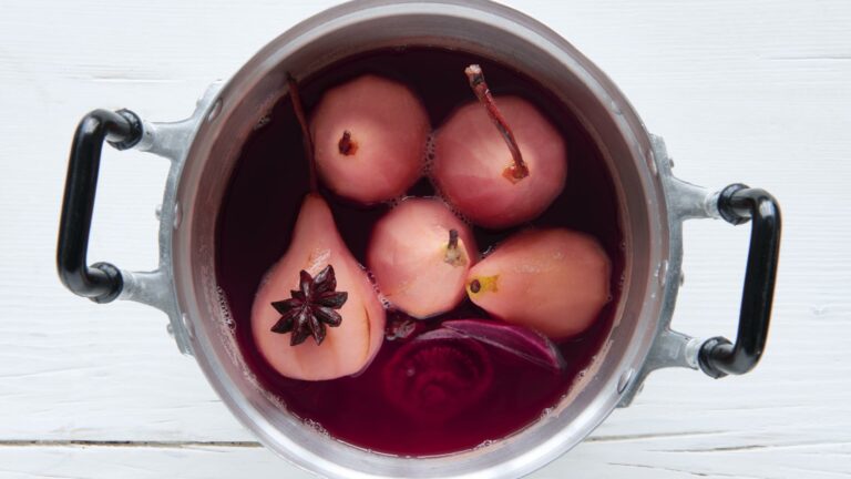 Die Birnen kann man gut einen Tag im Voraus zubereiten. Dann schmecken sie noch aromatischer. Für den Sud Honig, 5 dl Wasser, Gewürze, Randen- oder Beerensaft, Zitronensaft und Salz unter Rühren aufkochen und so lange köcheln lassen, bis sich der Honig in der Flüssigkeit aufgelöst hat. Das Kerngehäuse der Birnen mit dem Kugelausstecher von der Fliege her auslösen, dann die Biernen schälen. So aromatisiert der Würzsud die Birnen auch von innen. Die Birnen in den leicht kochenden Sud legen und mit einem Backpapierkreis bedecken. So sind die Früchte ständig mit Sud bedeckt. 20 Minuten köcheln lassen. Oder so lange, bis sie knapp weich, aber nicht matschig sind.