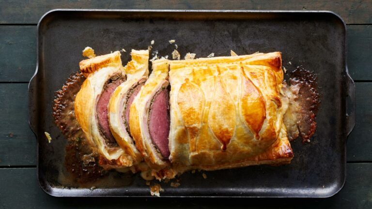 Backofen auf 200 Grad vorheizen. Rindsfilet im Teig nochmals mit Eigelb bestreichen. In der Mitte des Ofens 20–25 Minuten backen. Herausnehmen, 10 Minuten ruhen lassen. Dann in breite Stücke schneiden.