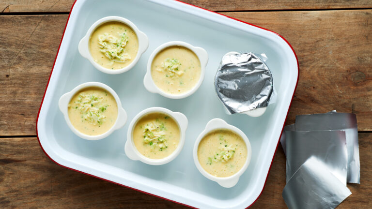 Backofen auf 160 Grad vorheizen. Broccoli zerteilen, Röschen ca. 5 Minuten kochen. Absieben und hacken. Emmentaler AOP fein reiben. Emmentaler AOP, Eier, Eigelb, Rahm und Broccoli vermischen, mit Muskatnuss, Salz und Pfeffer würzen. Kleine Souffléförmchen gut mit Butter ausstreichen. Masse einfüllen, mit Folie verschliessen und in eine Gratinform stellen. Mit siedendem Wasser auffüllen, bis die Förmchen zu zwei Drittel im Wasser stehen. Im 160 Grad heissen Ofen ca. 45 Minuten garen.