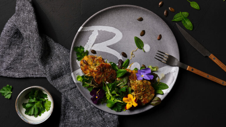 Salat und Knödel auf einen Teller anrichten, mit Blumen und Kürbiskernen garnieren und die Salatsauce darüber verteilen.