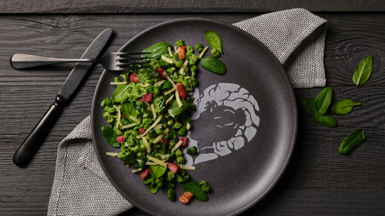 Spinat und Quark fein pürieren. Das Mehl in eine Schüssel sieben, anschliessend Eier und Spinat-Quark Püree beigeben. Mit Salz und Muskat würzen. Die Masse mit einer Kelle mischen und so lange klopfen, bis der Teig Blasen wirft. Nun den Teig zugedeckt bei Raumtemperatur ca. 20 min gehen lassen.