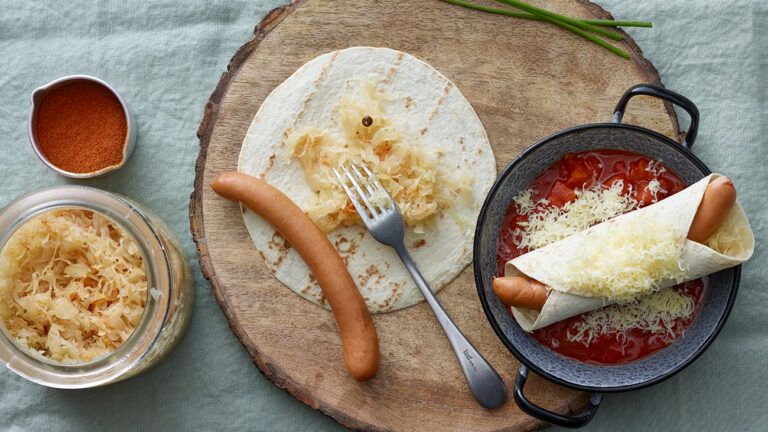 Tomaten in eine gefettete ofenfeste Form giessen, mit Salz und Pfeffer würzen. Sauerkraut etwas abtropfen, mit Paprika würzen. Sauerkraut auf die Tortillas verteilen und je ein Wienerli darauflegen. Tortillas aufrollen und auf die Tomaten legen.