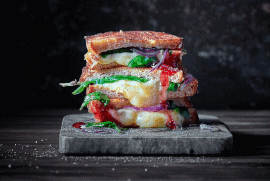 «Finely sliced Emmentaler AOP Cave-aged is best eaten in a “Caveman” cheeseburger: with a light spelt bun and a slice of tomato, some fried onions and a spoonful of crème fraîche.»