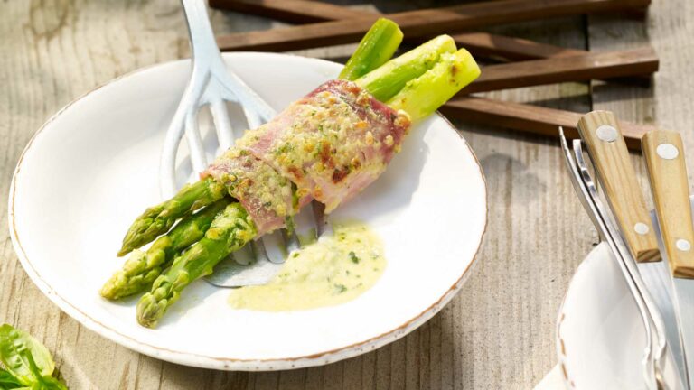 Pour the creamy mix over the asparagus. Gratinate in the centre of a hot oven at 220 degrees for around 15 minutes, until golden brown.