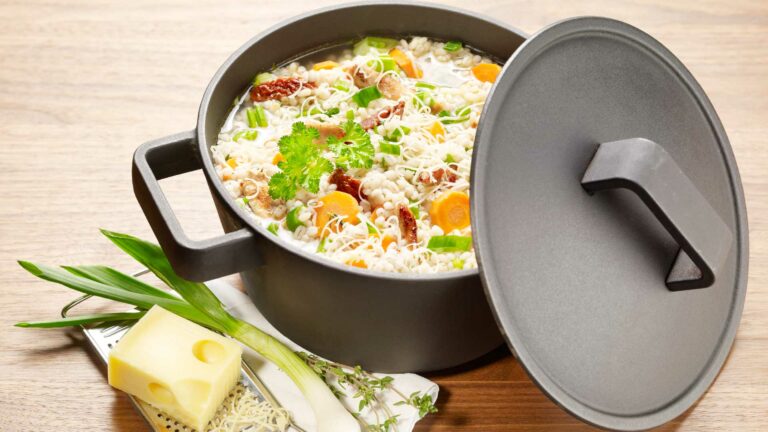 Season the chicken, fry in the remaining oil and add to the barley. Finely grate the Emmentaler AOP. Mix into the barley or serve separately. Scatter the spring onions over the barley.