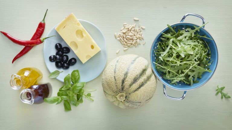 Lightly toast the pine nuts in a frying pan without fat. Dice the Emmentaler AOP into approx.1cm size cubes. Cut the chili in half lengthways, remove the seeds and cut into thin strips. Halve the melons, remove the seeds and using a melon baller, make balls from the flesh of the fruit. Tear the basil leaves from the stalks.