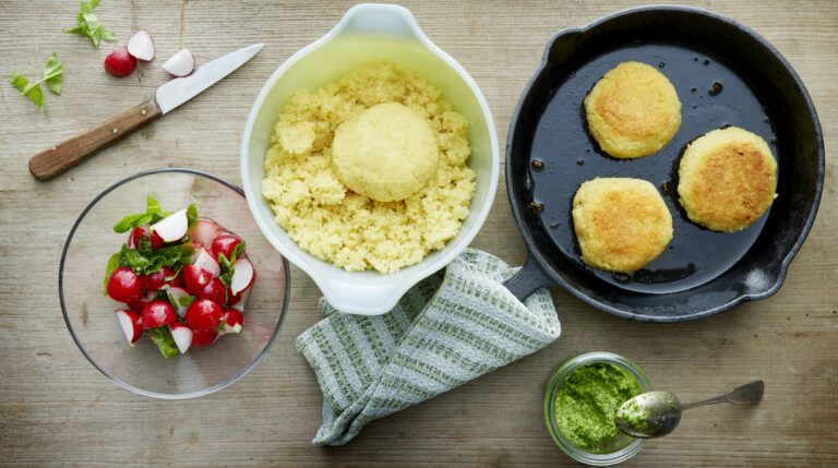 Couscous Tätschli with green dressing and radish salad
