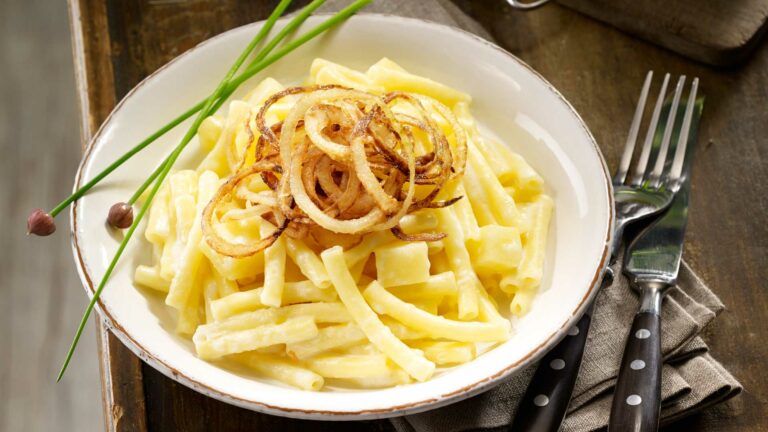 Peel the potatoes and cut into cubes of around 1.5 cm. Boil the potatoes with stock, milk, pepper and a little salt. Add the Alpine macaroni. Leave to boil gently for 8-10 minutes, stirring frequently. In the meantime cut the onions into thin rings. Cover with flour, then lift and shake off the excess flour. Fry the onion rings until crispy in the hot butter. Finely grate the Emmentaler AOP. Mix the grated Emmentaler AOP with the pasta and season to taste with salt and pepper. Distribute the onion rings over the Alpine macaroni. Goes well with apple puree.