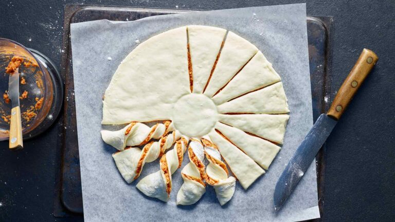 Divide dough into two equal halves and roll each half into a thin circle about 30 cm in diameter. Place one of the circles onto a baking tray lined with parchment paper. Spread the cheese-tomato puree on top. Place the second circle of pizza dough on top and press down gently. Place a glass in the centre. Using a sharp knife make 16 cuts from the outside of the dough until the edge of the glass. Twist the strips 2-3 times. Remove glass.