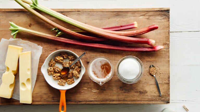Serve the Emmentaler AOP with the rhubarb chutney and the honeyed walnuts.