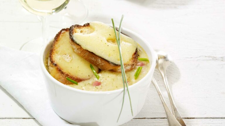 Cut the chive into rolls. Cut the Emmentaler AOP into 3 mm thin strips and slice the bread into strips of around 7 mm . Place the bread strips on a baking tray and quckly toast under a hot grill. Place the strips of cheese on top of the toasted bread and grill for another 2 minutes, until the cheese is slightly melted.