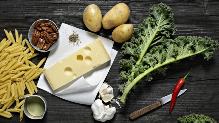 Strip the kale leaf from the stalk and chop into bite-size pieces. Peel potatoes, halve or quarter them and cut into 5 mm thick slices. Finely chop the garlic cloves. Deseed the red chili pepper and cut into rings. Grate the Emmentaler AOP using a coarse grater. Roughly chop the pecan nuts.