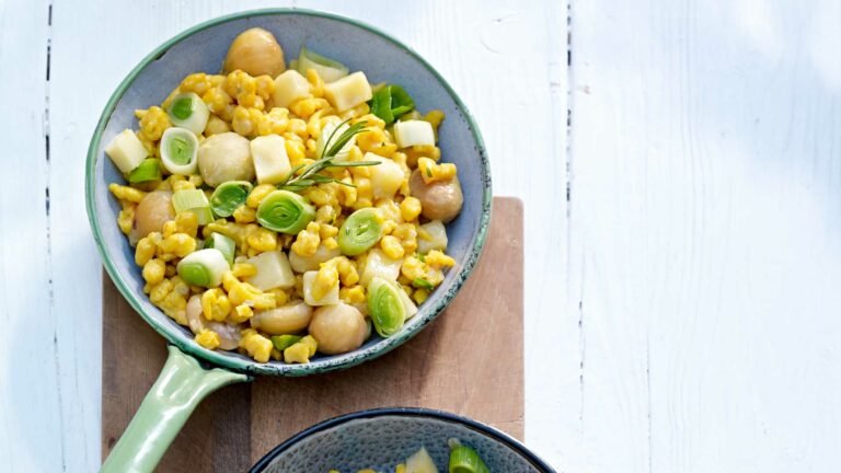 Cut the Emmentaler AOP in small cubes. Heat a good amount of salted water. Push the dough through a button spaetzle sieve in portions directly into the simmering water. As soon as the button spaetzle rise to the surface of the water remove using a slotted spoon. Add the button spaetzle to the chestnut mix, heat briefly and mix in the cubes of cheese.