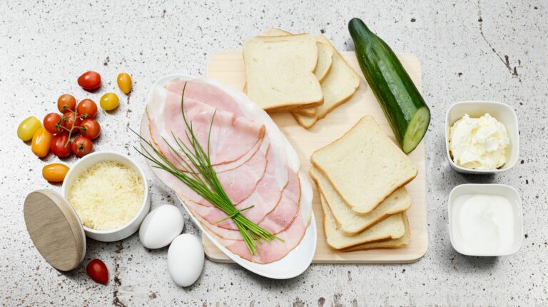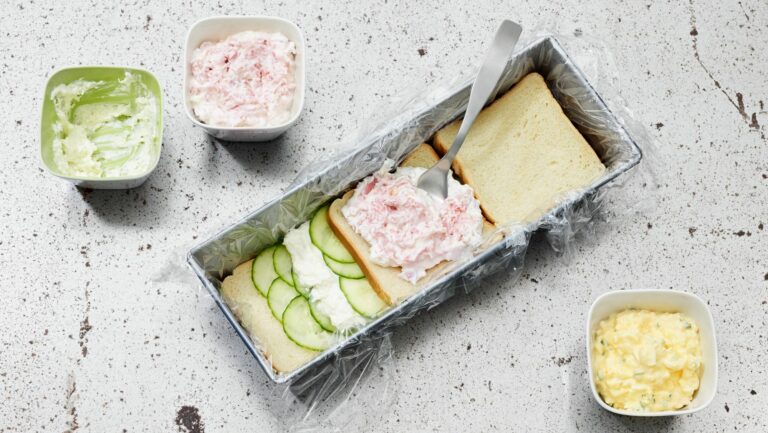 Line the cake tin with cling film. Place 3 slices of toast side by side in the tin, cover with half the cucumber slices. Spread the cheese mixture on top, cover with the remaining cucumber slices and top with 3 slices of toast. Continue with the ham mixture, toast, egg mixture and finally 3 slices toast. Cover with cling film and place in fridge for a couple of hours.