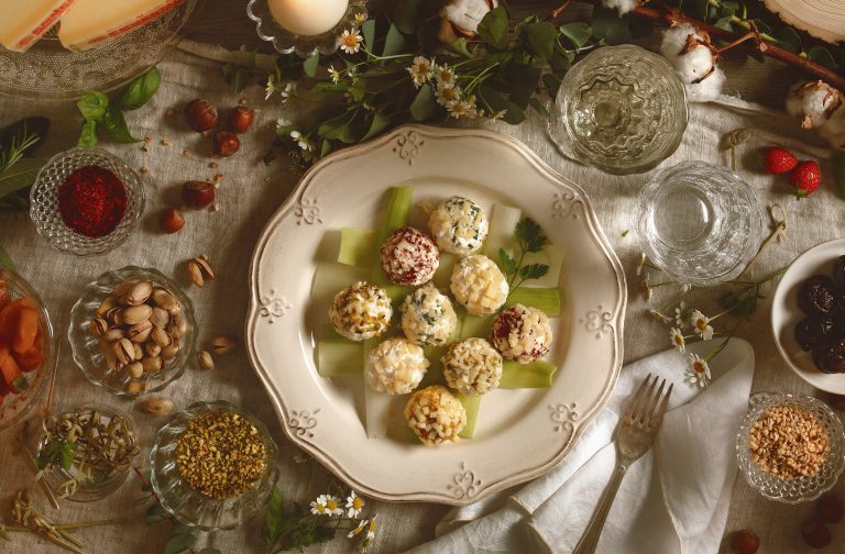 Roughly grate some of the Emmentaler AOP using a food processor, put into a bowl and mix well with the goat’s cheese to form a creamy mixture. Using a knife, dice the remaining Emmentaler AOP into very small cubes and place on a plate. Arrange the chopped nuts and spices onto small plates. Cut the dried plum and dried apricot into four pieces each.
