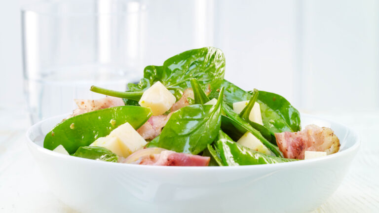 Cut the Emmentaler AOP into small 1 cm sized cubes. Add cheese, spinach and bacon to the dressing and mix well.