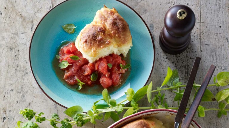 Remueve todos los ingredientes para la mezcla. Vierte la mitad en una bandeja para gratinar (de aprox. 20 x 30 cm). Forma 8 bolas con la masa y colócalas en la mezcla. Deja que repose 20 minutos.