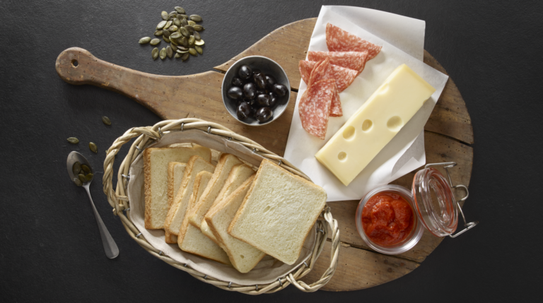 Corta el queso Emmentaler AOP (D.O.P.) con un cortaquesos o un pelador en tiras y corta las aceitunas de forma transversal. Coloca las rebanadas de pan de molde sobre dos bandejas para horno con papel sulfurizado. Esparce la salsa de pizza sobre las rebanadas de pan y cúbrelas con las rodajas de salami. Esparce las tiras de queso y decora las medias aceitunas para los ojos y unas pipas de calabaza para los dientes de la careta de monstruo.
