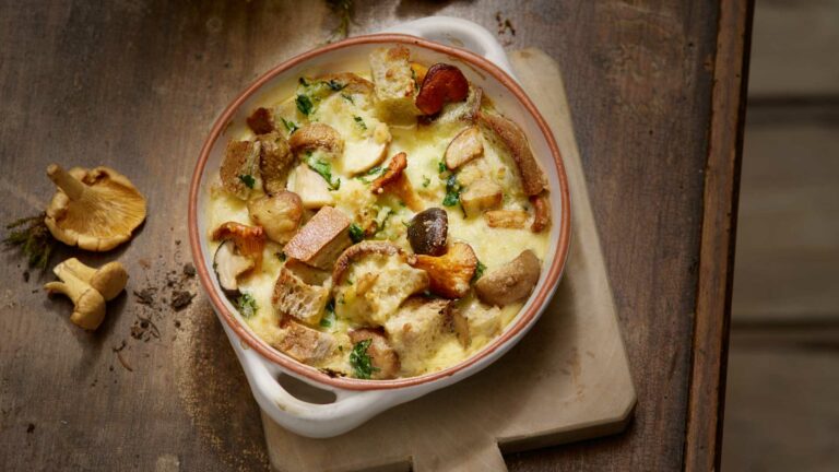 Cazuela de pan y Emmentaler con setas