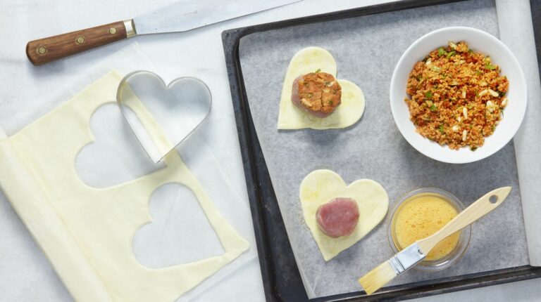 *en lugar de cortar formas de corazón, puedes cortar 12 rectángulos, así aprovechas mejor el rollo de masa de hojaldre.