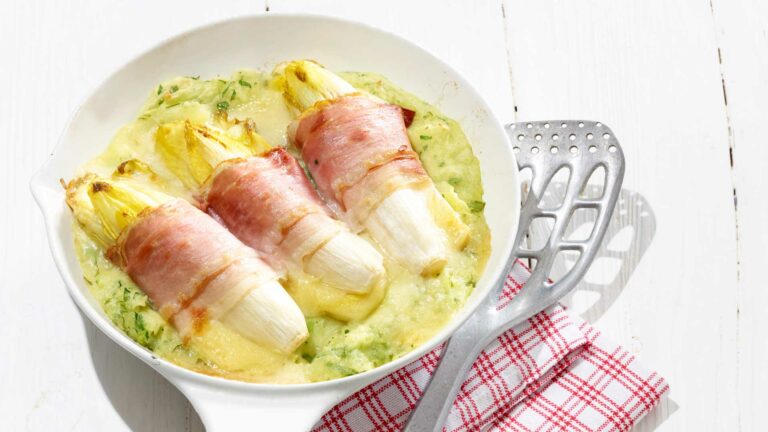 Mientras tanto, corta las endividas a lo largo, cuécelas hasta que se ablanden un poco en una olla tapada con un poco de agua con sal durante 5-10 minutos. Deja que se sequen. Corta el Emmentaler AOP en trozos de aprox. 7 mm. Cubre las 4 mitades de endivia con lonchas de queso y cúbrelas con las otras mitades. Luego, enrróllalas con el jamón.
