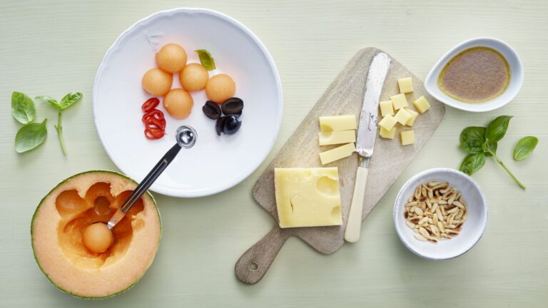 Parte los melones por la mitad, sácales los granos y haz bolitas con ayuda de una cuchara saca bolas. Quita los tallos a las hojas de albahaca.