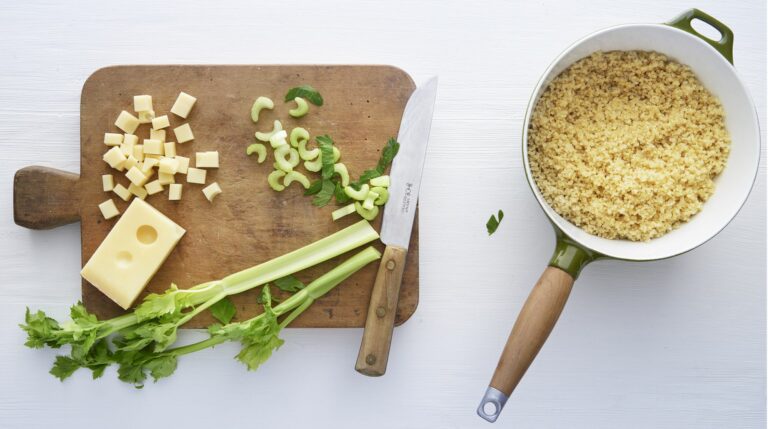 Corta el queso Emmentaler AOP (D.O.P.) en dados pequeños y los tallos de apio en rodajitas finas. Después tritura ligeramente los granos de pimienta rosa, añade todos los ingredientes a la salsa y mézclalos bien.