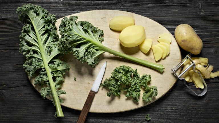 Comienza por separar los troncos de las hojas de col rizadas y corta las hojas en trocitos. Pela las patatas, córtalas por la mitad y en cuatro partes, en rodajas de 5 mm de espesor.