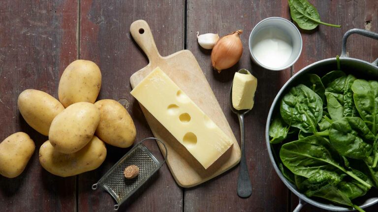 Mientras que cueces las patatas, puedes picar la cebolla y el diente de ajo fino y rehogarlo en mantequilla caliente. Añade las espinacas y sigue rehogando hasta que se deshagan, sazónalas con sal, pimienta y nuez moscada. Después cuela las espinacas y escúrrelas ligeramente.