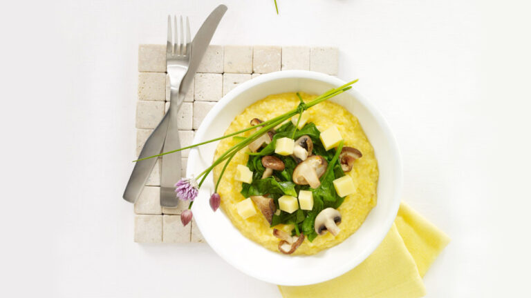 Pon a hervir el caldo. Añade la polenta de manera gradual, sin dejar de remover. Removiendo de vez en cuando, tápala y deja cocer a fuego lento 30-40 minutos. Corta el Emmentaler AOC en pequeños dados de 1 cm.