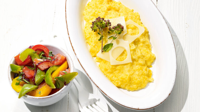 Quita las hojas y los pelos de las mazorcas. Saca los granos de la mazorca con un cuchillo, tendrás aprox. 500 g de granos de maíz. Lleva a ebullición el caldo con los granos de maíz, y deja a fuego lento 20 minutos. Tritura todo lo más fino posible. Añade la polenta y deja a fuego lento 10 minutos más. Remueve con frecuencia. Añade el Emmentaler AOP rallado y condimenta con sal y pimienta.