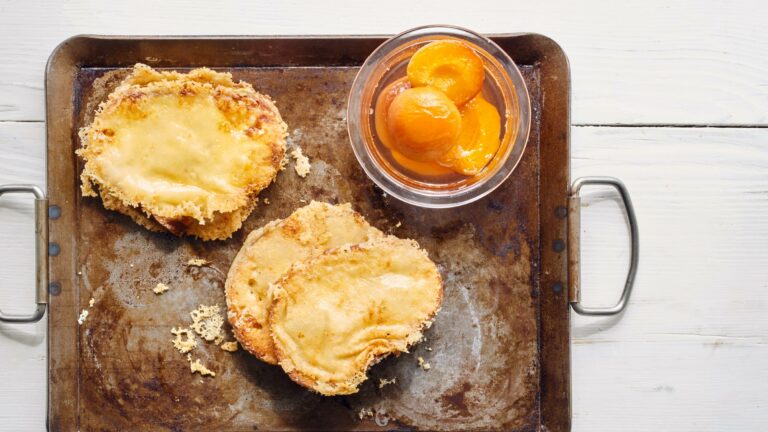 Prepara una sartén de teflón, úntala con manteca para freír y caliéntala. Por cada rebanada de pan colocas una cuarta parte del queso en la sartén, cúbrela con una rebanada de pan, fríela a fuego medio y rocíala con otra ¼ parte de queso Emmentaler AOP (D.O.P.). En cuanto esté tostada la cara inferior, le das la vuelta y fríes la otra cara. Sirve las rebanadas de pan tostadas con compota de albaricoque.