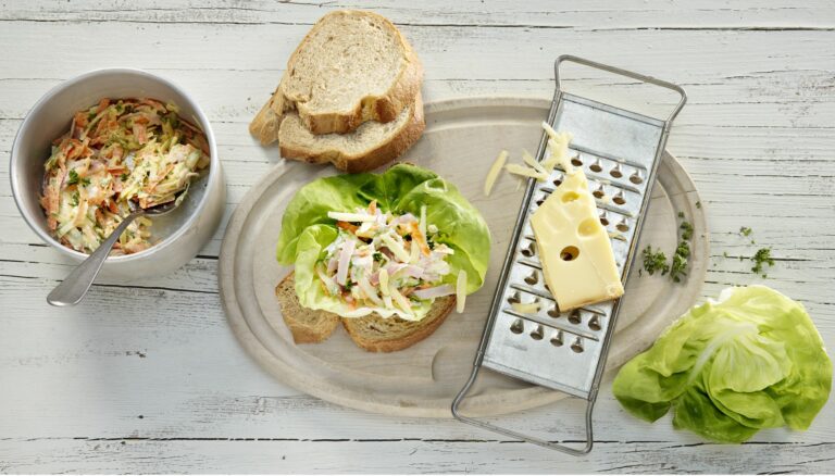 Corta el jamón en tiras finas y ralla el queso Emmentaler AOP (D.O.P.), las zanahorias y el pepino con un rallador; pica el perejil bien fino. Después mézclalo todo en un cuenco junto con el requesón descremado y la mostaza, remuévelo y sazona con sal y pimienta.