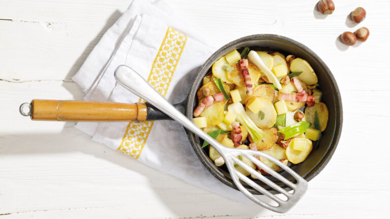 Trocea las avellanas y tuéstalas un par de minutos en una sartén grande. Luego, sácalas de la sartén. Dora la panceta sin aceite hasta que quede crujiente y luego sácala de la sartén. Calienta mantequilla y aceite de oliva. Echa las patatas y fríelas a fuego fuerte durante 10-12 minutos. No hay que removerlas demasiado.