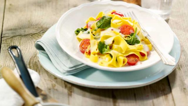 Pon a hervir agua con sal en una olla. Echa los tallarines y cuécelos al dente. Añade las espinacas cuando queden 2-3 minutos y cuécelas también. Escúrrelo todo bien. En la misma olla, calienta un poco los tomates, y échalos con los tallarines y las espinacas en un recipiente. Vierte la salsa de queso por encima, mézclalo todo y espolvorea la cáscara de limón y la pimienta rosa. Sirve inmediatamente.