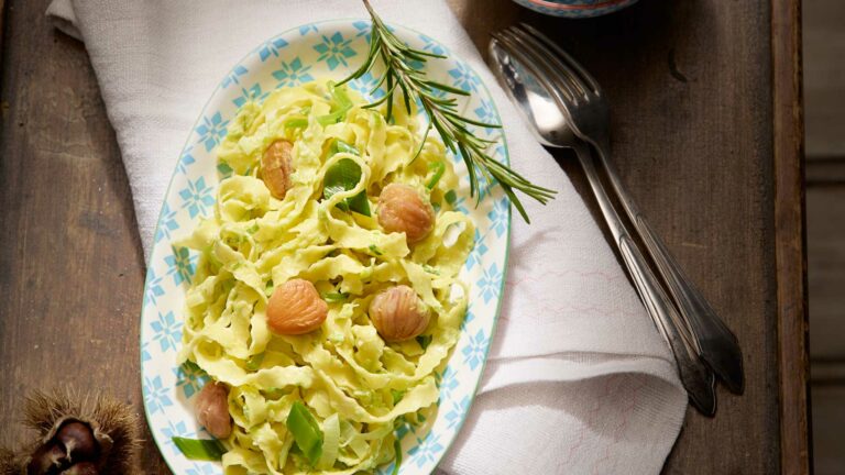 Tallarines con salsa de puerro y castañas