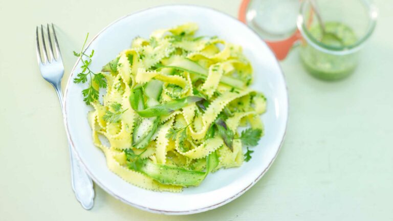 Tallarines de espárragos con pesto de hierbas aromáticas