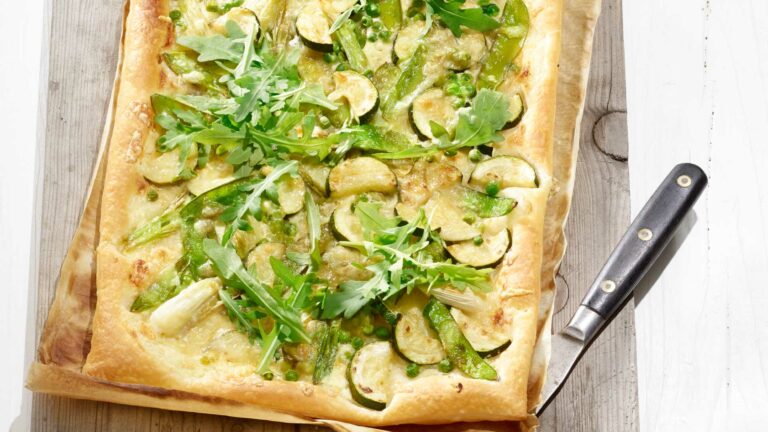 Ralla el Emmentaler AOP. Coloca la masa de hojaldre en una bandeja y pínchala varias veces con un tenedor. Extiende la crema agria por la masa, reparte la verdura y espolvorea el Emmentaler AOP.